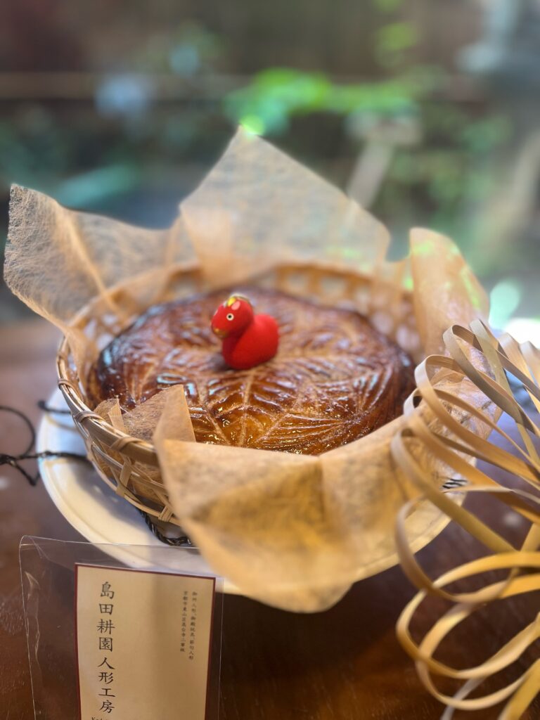 手織りのパイにアーモンドクリームと渋皮栗、アーモンドをいれて焼き上げた自慢のガレットデロワ。お正月にいただくフランスのお菓子です。本来はフェーブ(小さな陶器の人形)がパイの中に入っていて、家族で切り分けて食べ、フェーブが当たった人はその年一年幸福が訪れるといわれています。